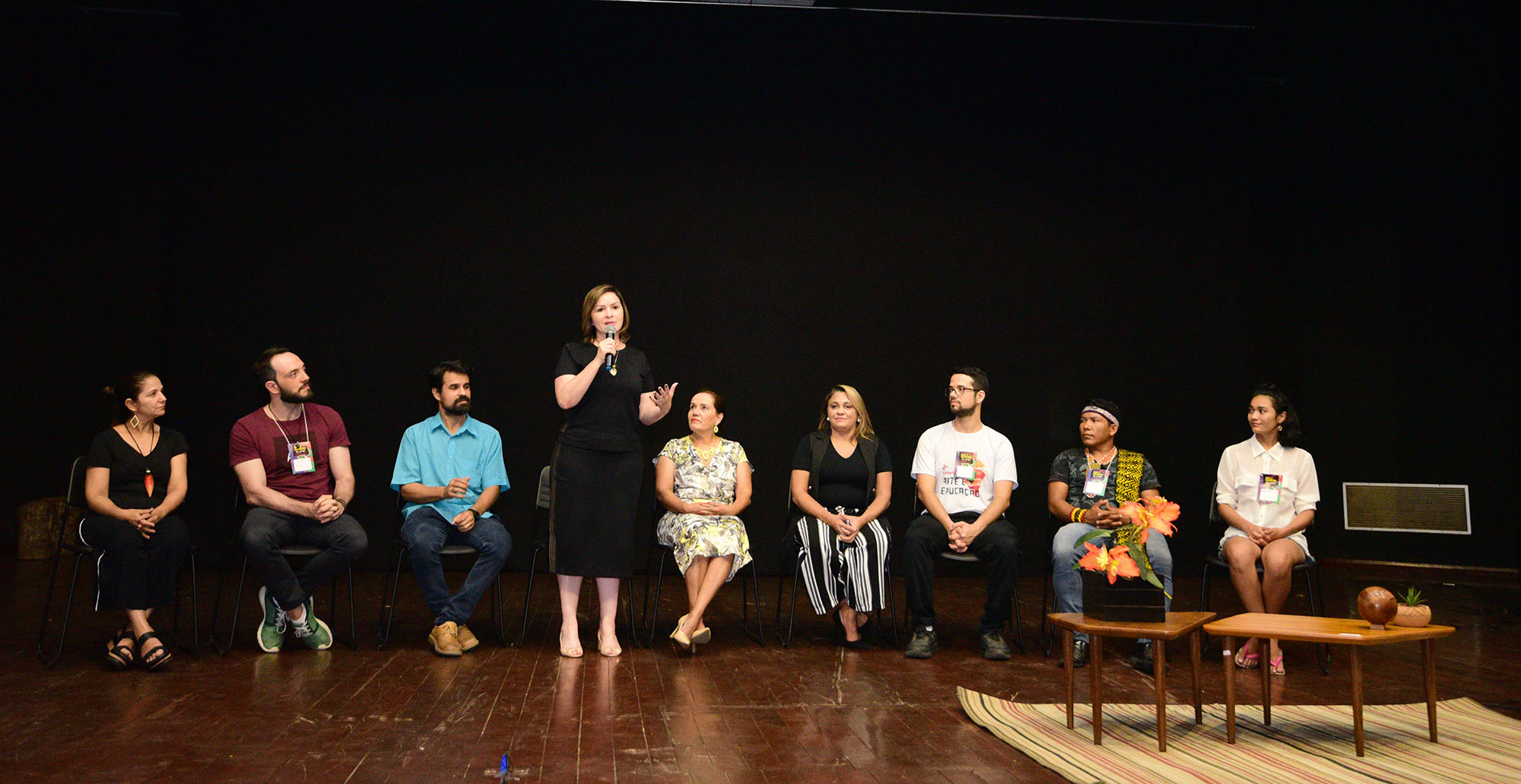 No dispositivo de honra da solenidade de abertura, ao lado da prefeita Socorro Neri, estavam: a pró-reitora de Graduação, Ednaceli Damasceno; o pró-reitor de Extensão e Cultura, Isaac da Silva; o representante da Faeb, Juliano Casimiro; a organizadora do Congresso Nacional da Federação de Arte/Educadores do Brasil, Eneila Almeida dos Santos; o representante dos alunos do PPG em Artes Cênicas da Ufac, Dasu Huni Kuin; e a representante dos graduandos, Jaqueline Chagas.