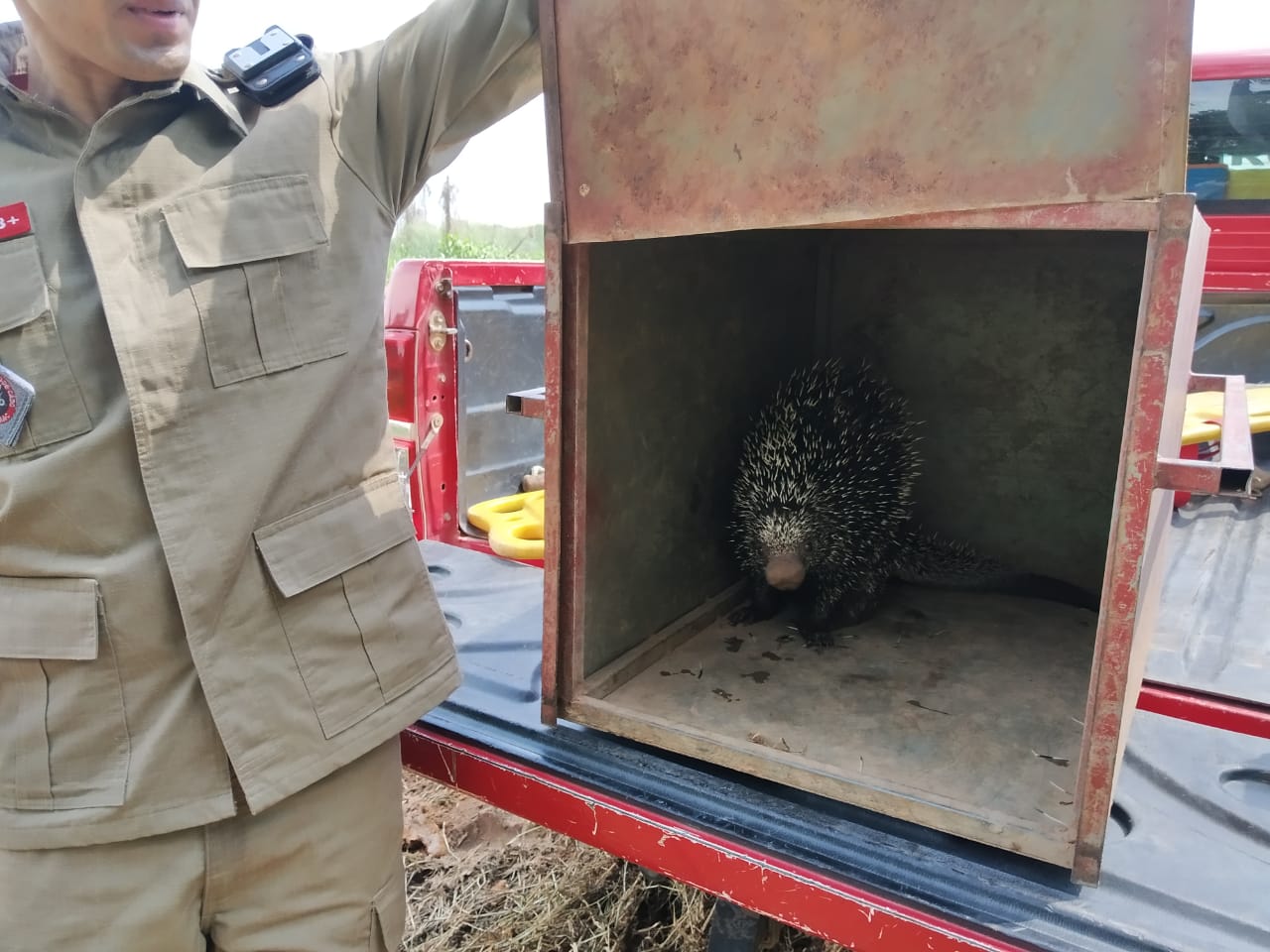 Segundo os bombeiros, era por volta das 12h e as crianças que se encaminhavam para a escola estavam com medo do “bicho”, já que o mesmo tem o hábito de lançar seus espinhos como forma de defesa própria, sendo necessária a intervenção dos profissional bombeiros, que estiveram no local e fazerem a captura do animal sem maiores dificuldades.
