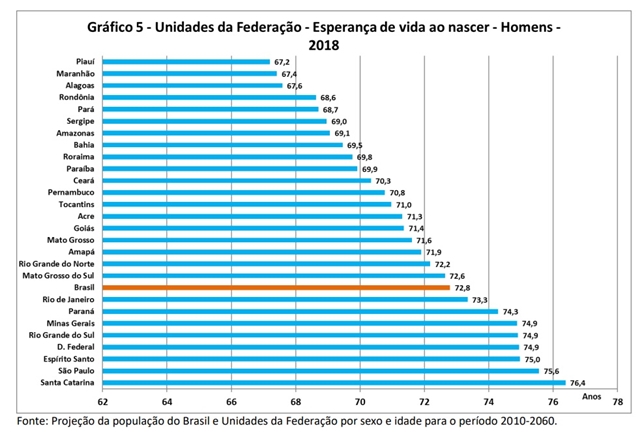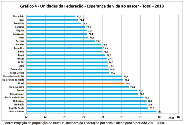 A tábua de mortalidade projetada para o ano de 2018 forneceu uma expectativa de vida de 76,3 anos para o total da população, um acréscimo de 3 meses e 4 dias em relação ao valor estimado para o ano de 2017 (76,0 anos).