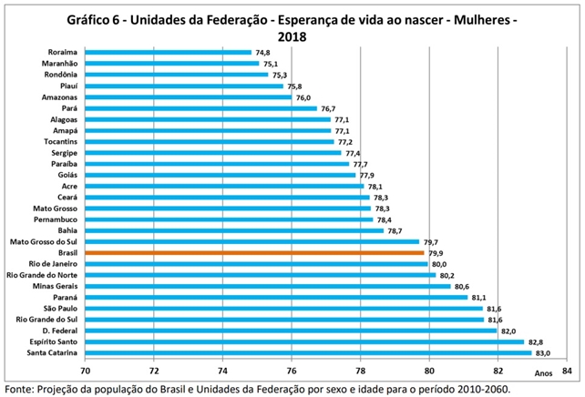 Para a população masculina o aumento foi de 3 meses e 7 dias passando de 72,5 anos para 72,8 anos, em 2018. Já para as mulheres o ganho foi um pouco menor, em 2017 a expectativa de vida ao nascer era de 79,6 anos se elevando para 79,9 anos em 2018 (exatos 3 meses maior).
