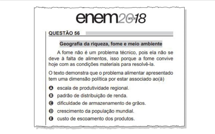 O Inep identificou que a referida questão fez parte do Caderno de Questões Braile e Ledor da aplicação do Enem 2018 (questão 56 do Caderno Laranja). O caderno Ledor é preparado para os aplicadores que atuam como ledores para os participantes que, por algum motivo, solicitam auxílio para a leitura da prova como recurso de acessibilidade.