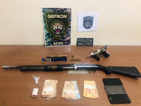 A patrulha apeendeu uma espingarda calibre 12 e uma pistola modelo Colt 45