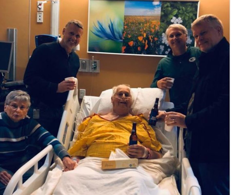 Em uma imagem que rapidamente viralizou no Twitter, o idoso, de Appleton, nos Estados Unidos, é clicado dividindo a bebida com a família. Ao lado da cama de Schemm, estão a esposa, Joanne, e os filhos, Bob, Tom e John.
