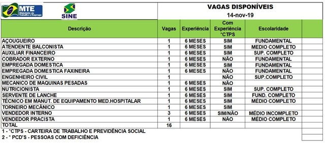 O Sistema Nacional de Emprego do Acre (Sine) disponibiliza 16 vagas para diversas áreas, nesta quinta-feira (14). Os candidatos interessados devem comparecer pessoalmente à instituição, localizada na Avenida Getúlio Vargas, n°1.670, em Rio Branco.