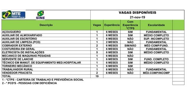 O Sistema Nacional de Emprego do Acre (Sine) disponibiliza 19 vagas para diversas áreas, nesta quinta-feira (21). Os candidatos interessados devem comparecer pessoalmente à instituição, localizada na Avenida Getúlio Vargas, n°1.670, em Rio Branco.