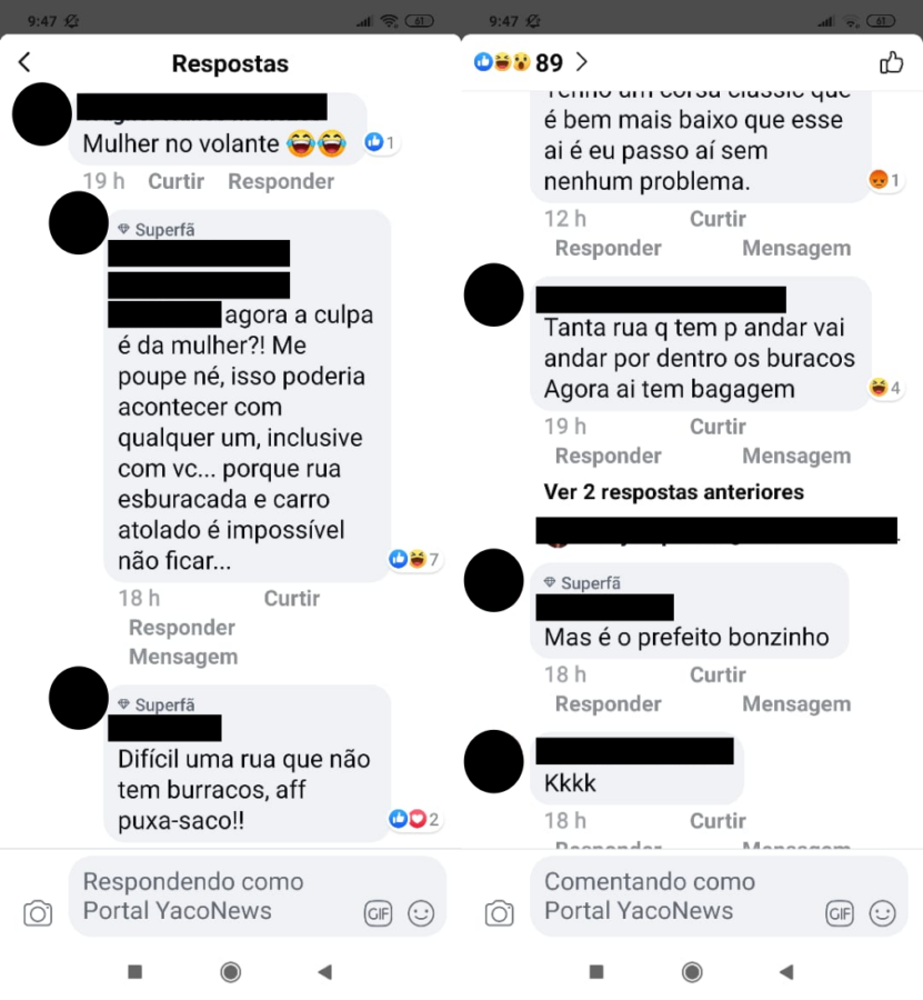 Porém, mesmo com o enorme buraco, alguns internautas decidiram colocar a culpa pelo carro ter atolado na mulher, como mostra o print: