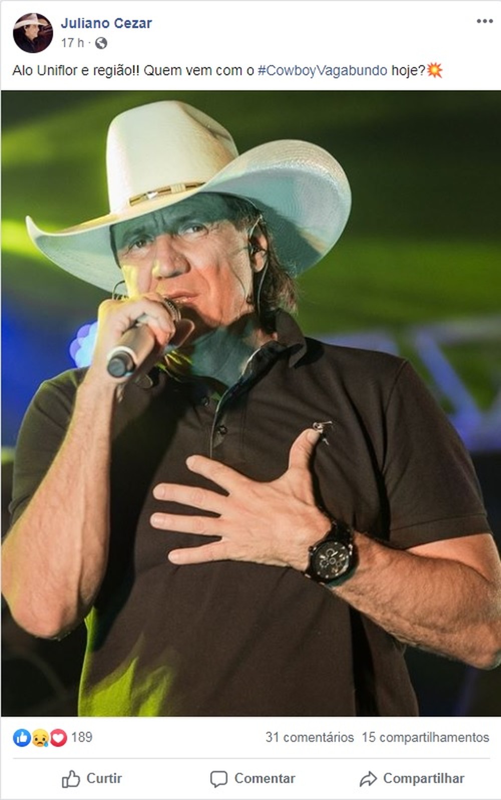 “Rumo a Goiânia”, “Faz Ela Feliz”, “Bem Aos Olhos da Lua” e “Cowboy Vagabundo” estão entre os sucessos de Juliano Cezar.