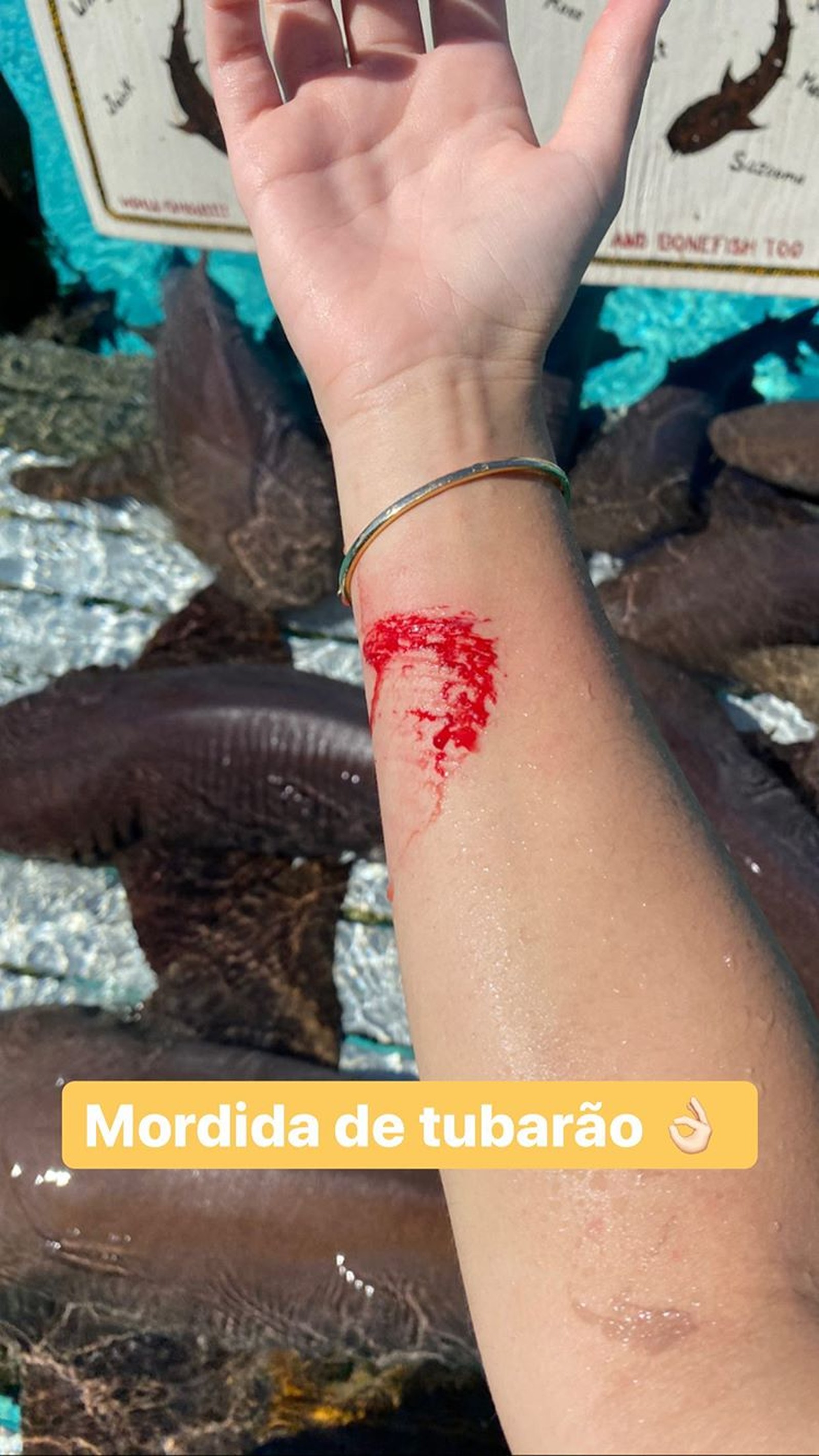 A influencer Ana Bruna Avila passou por um susto durante sua viagem nas Bahamas. Em uma tentativa de fazer uma foto entre tubarões em Exuma, ela acabou levando uma mordida de um dos animais.