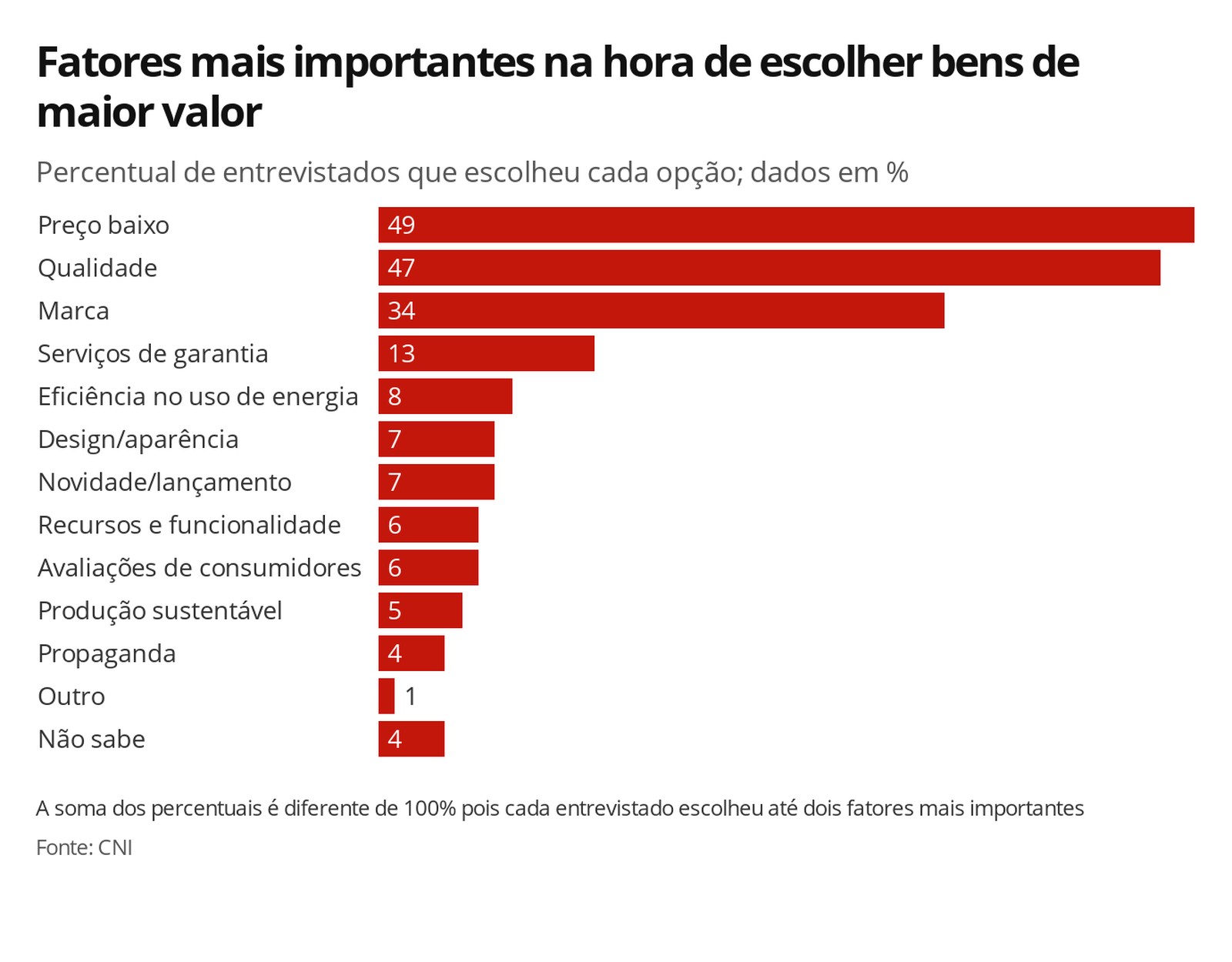 Entre o fatores mais importantes na hora de escolher bens de maior valor, os entrevistados apontaram preço baixo (49%), qualidade (47%) e marca (34%).