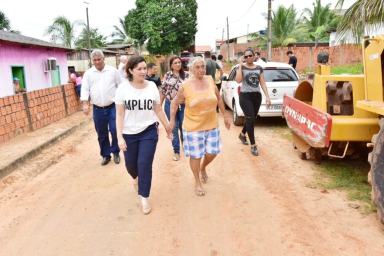 Após assinar ordem de serviço para construção de quadra de grama sintética no bairro Nova Estação, a prefeita Socorro Neri percorreu ruas do bairro Placas para acompanhar serviços de manutenção viária.
