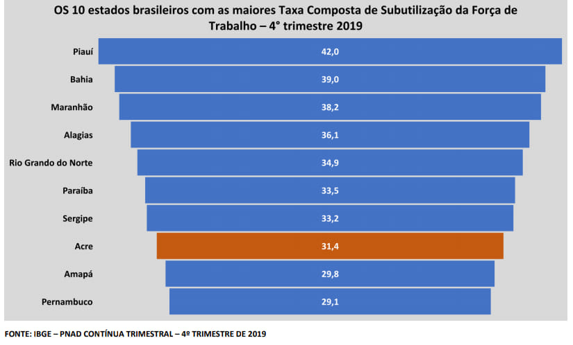 O Acre chegou, em fevereiro de 2020, ao quarto trimestre com a oitava maior taxa de subutilização da força de trabalho, com 31,4% – atrás apenas do Piauí, com a maior taxa, de 49%, Bahia, com 39%, e Maranhão, que ficou com 38,2%. Os dados são do IBGE (Instituto Brasileiro de Geografia e Estatística) e foram publicados no último boletim do PNAD (Pesquisa Nacional por Amostra de Domicílios), realizada anualmente nos domicílios brasileiros para apurar características gerais da população, incluindo dados de educação, trabalho, rendimento e habitação, além de levantar, com periodicidade variável, outros temas, de acordo com as necessidades de informação para o país.