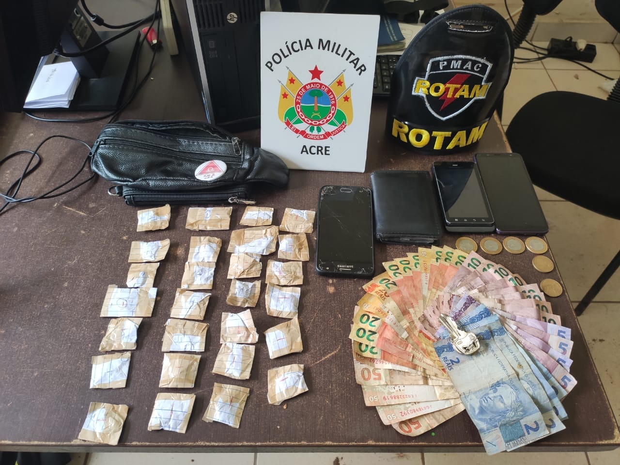 Ainda durante as buscas, a equipe localizou em uma pochete 27 pacotes de maconha e 556 reais. Questionados sobre a droga, a dupla informou que seriam revendidas em um carnaval da capital.