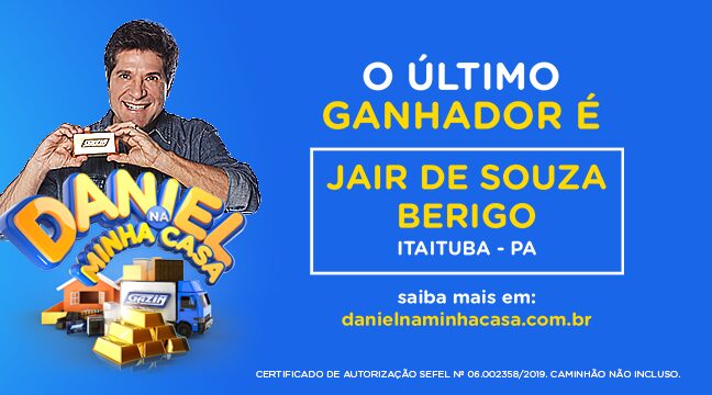 Jair de Souza Berigo, de Itaituba, no Pará, foi o grande sortudo nesta noite de quarta-feira, em Três Lagoas – MS. Nesta última quarta-feira, dia 29, foi realizado o último sorteio da Promoção Gazin e Daniel na Minha Casa. O grande evento foi realizado em Três Lagoas, a 330 km da capital do Mato Grosso. O palco foi montado na Rua Paranaíba, 573, próximo ao relógio da Praça Central. Segundo o departamento de marketing da Gazin, nesta segunda etapa, foram gerados mais de 9 milhões de cupons, o grande sortudo foi Jair de Souza Berigo, de Itaituba, no Pará. Jair receberá o seu prêmio de R$ 53 mil reais em barras de ouro e mais R$ 53 mil reais em produtos de alto padrão em sua casa pessoalmente pelo cantor Daniel. Ele realizou sua compra na loja da Gazin na cidade de Itaituba, no Pará, o que gerou o cupom premiado nesta noite de quarta.