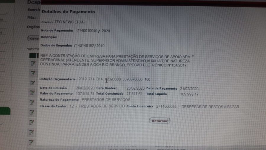 Dados obtidos por meio do Portal da Transparência mostram que o governo do Estado, por meio da Secretaria de Planejamento e Gestão (Seplag), realizou o repasse para a empresa responsável pelo fornecimento de serviço terceirizado na Organização Central de Atendimento (OCA), em Rio Branco.