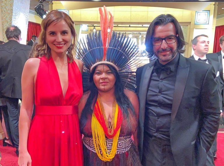 Petra Costa e Ricardo Stuckert com a líder indígena Sônia Guajajara, que afirmou: “precisamos parar os ataques à nossa democracia, à Amazônia e aos povos indígenas”