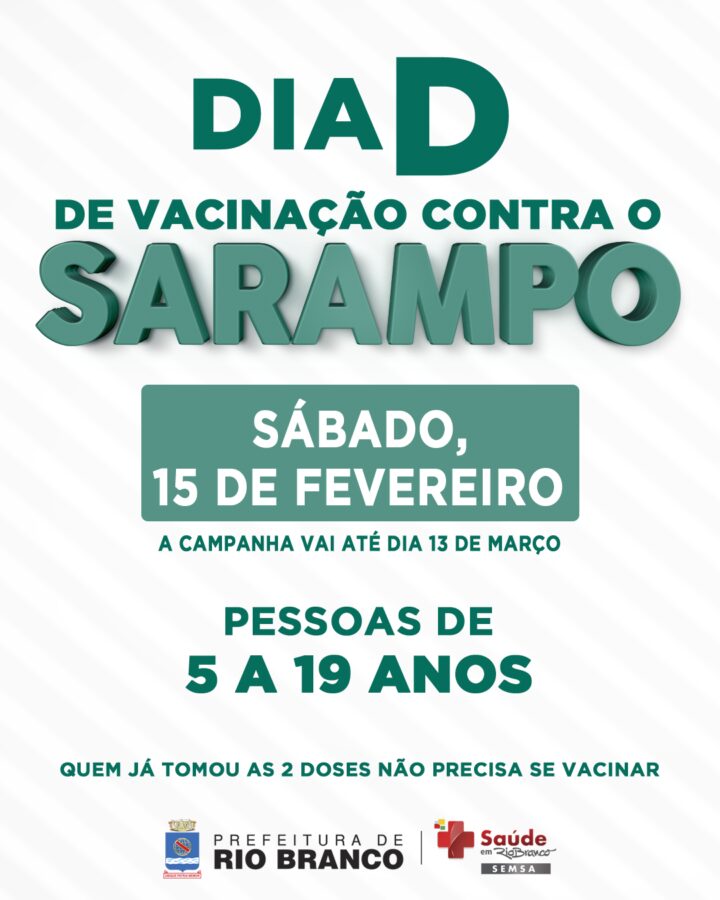 A Prefeitura de Rio Branco, por meio da Secretaria Municipal de Saúde (Semsa), realiza neste sábado, 15, o Dia D da campanha de vacinação contra o sarampo com objetivo de imunizar a população susceptível ao vírus do sarampo, na faixa etária de 5 a 19 anos de idade. A vacina é a única prevenção contra essa doença.