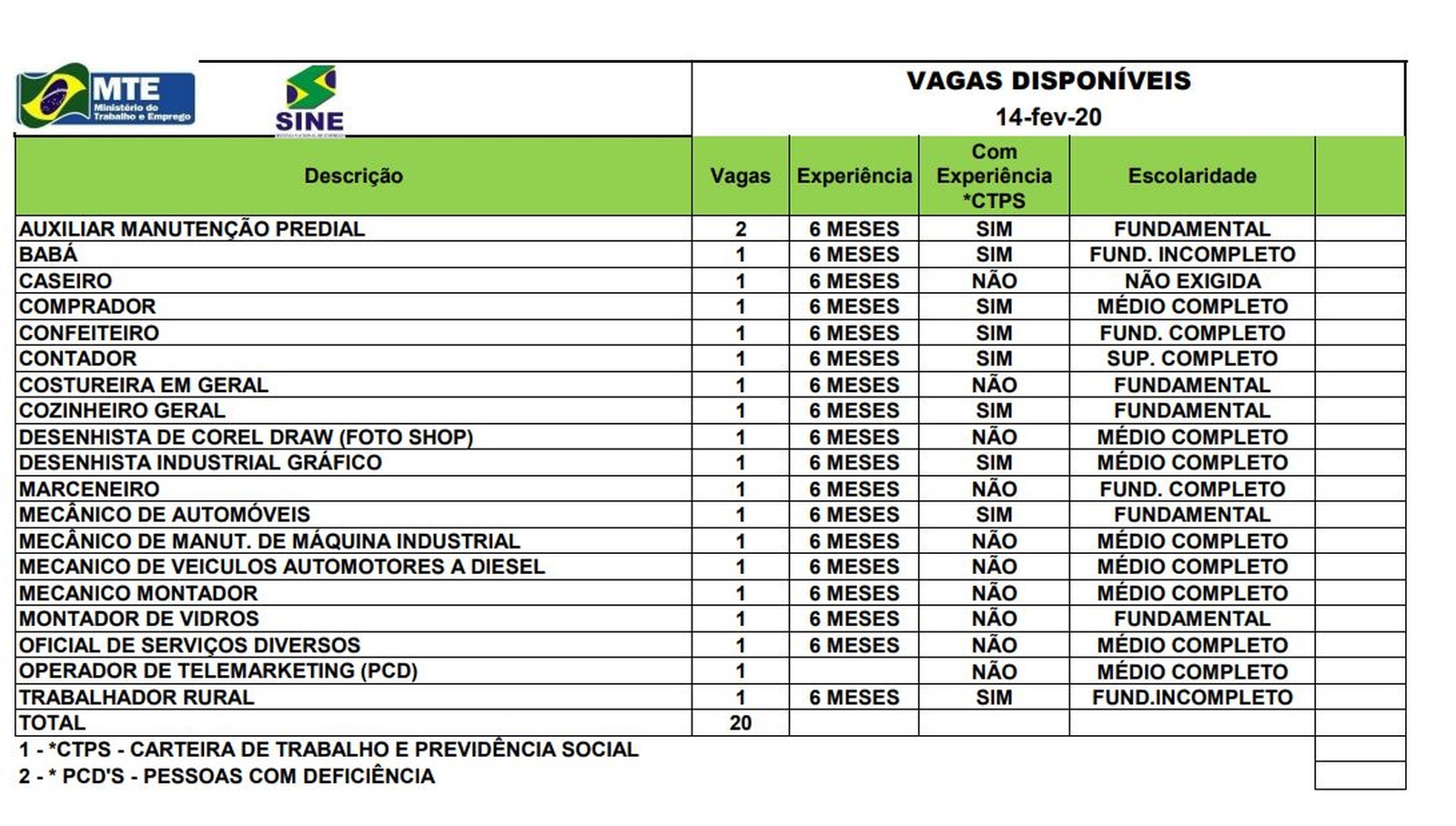O Sistema Nacional de Emprego do Acre (Sine) disponibiliza 19 vagas para diversas áreas nesta sexta-feira (14) em Rio Branco. Os candidatos interessados devem ir até a OCA, na rua Quintino Bocaiúva, 299 – Centro.
