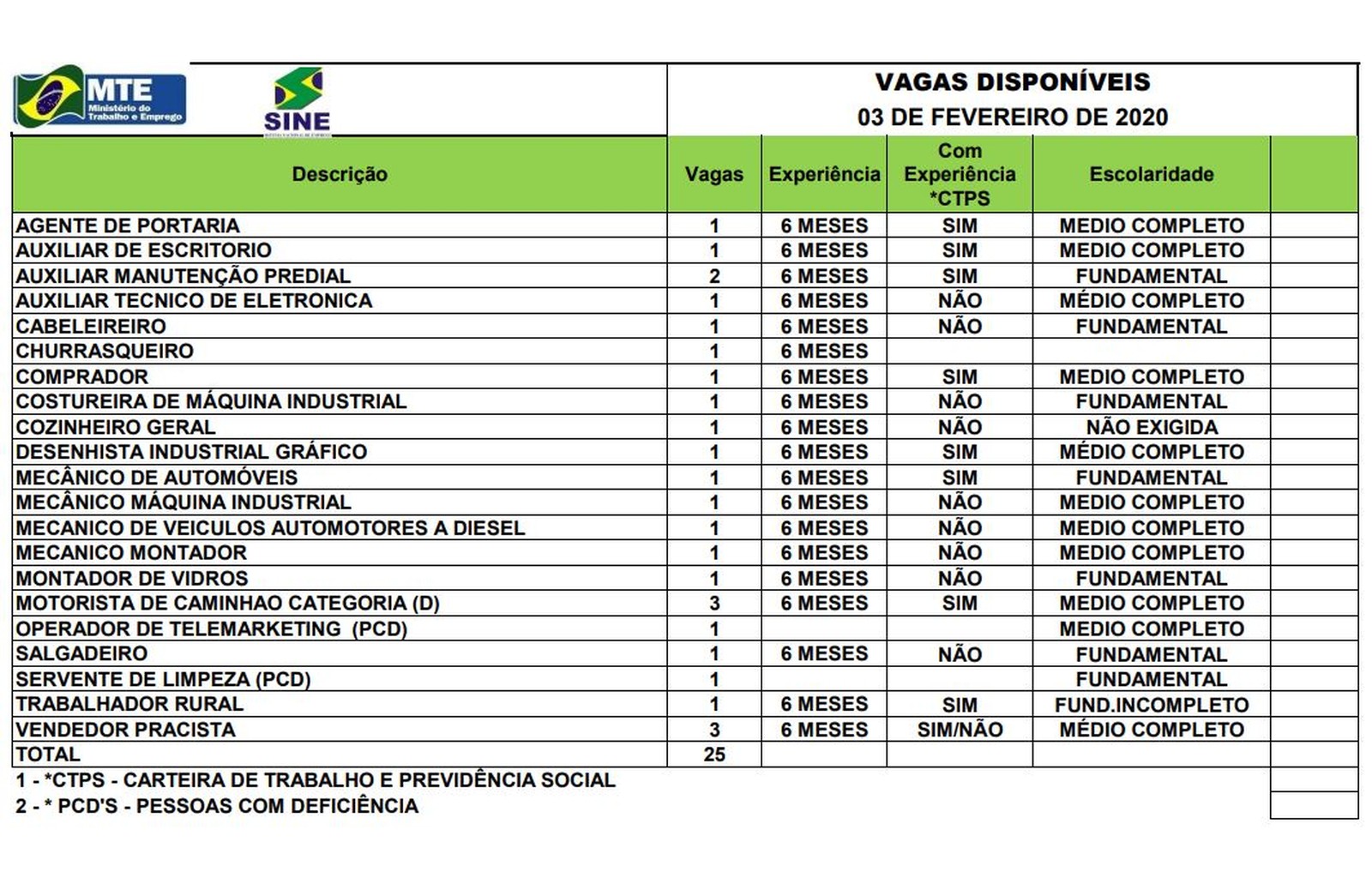 O Sistema Nacional de Emprego do Acre (Sine) disponibiliza 25 vagas para diversas áreas nesta segunda-feira (3) em Rio Branco. Os candidatos interessados devem ir até a OCA, na rua Quintino Bocaiúva, 299 – Centro.