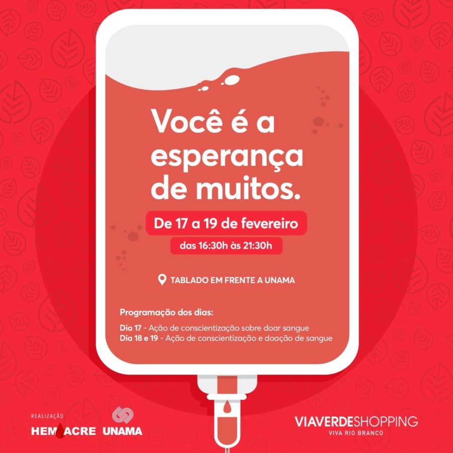Nos dias 17, 18 e 19/02 das 16:30 às 21:30, a Unama Rio Branco em parceria com Hemoacre e Via Verde Shopping participam de campanha de ação de conscientização e doação de sangue.
