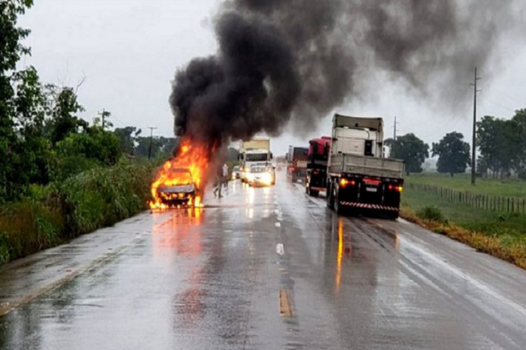 Veículo pega fogo e fica destruído na BR-364 durante viagem de casal para o Acre