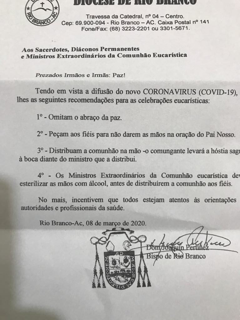 Neste domingo (8), a Diocese de Rio Branco emitiu um comunicado aos fieis com orientações afim de evitar contágio do novo corona vírus. Assinado pelo bispo Dom Joaquim Pertiñez, o documento pede que durante a missa, os fiéis evitem o “abraço da paz” e não deem as mãos durante a oração do Pai Nosso.