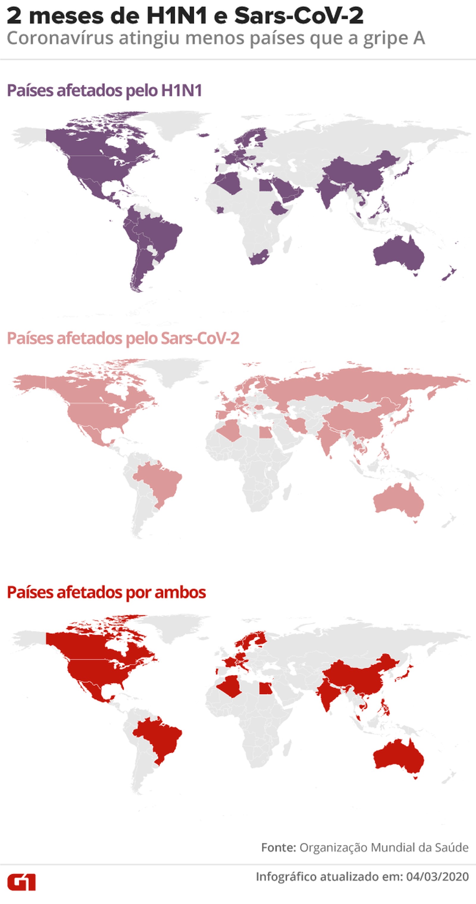 A comparação entre o total de países afetados na atual epidemia do novo coronavírus (Sars-CoV-2) e na pandemia causada pelo H1N1 mostra que a Covid-19 teve número 41,8% inferior de territórios afetados. O cálculo considera igual período de dois meses no começo da circulação de cada vírus.