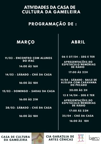 A Cia Garatuja de Artes Cênicas e o Grupo Beco prepararam uma programação de atividades na Casa de Cultura da Gameleira. Neste sábado e domingo acontecem, respectivamente, o Chá da Casa e Sarau da Casa, ambas com início às 16h.