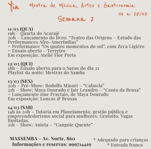 Localizada no Tucumã, a casa Massemba continua com sua programação Yin: Águas e Deusas de Março. Serão mais de 10 show musicais, minicursos e oficinas, intervenções e performances, exposições, artes circenses, ciclos de leituras e homenagens, brechó, bazar, artesanato, comidas, bebidas e festa latina.