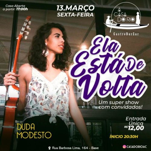 Após uma pausa para a maternidade, a cantora Duda Modesto volta aos palcos e se apresenta com banda e convidados nesta sexta-feira (13), na Casa do Rio. No repertório, som dançante nacional e internacional.