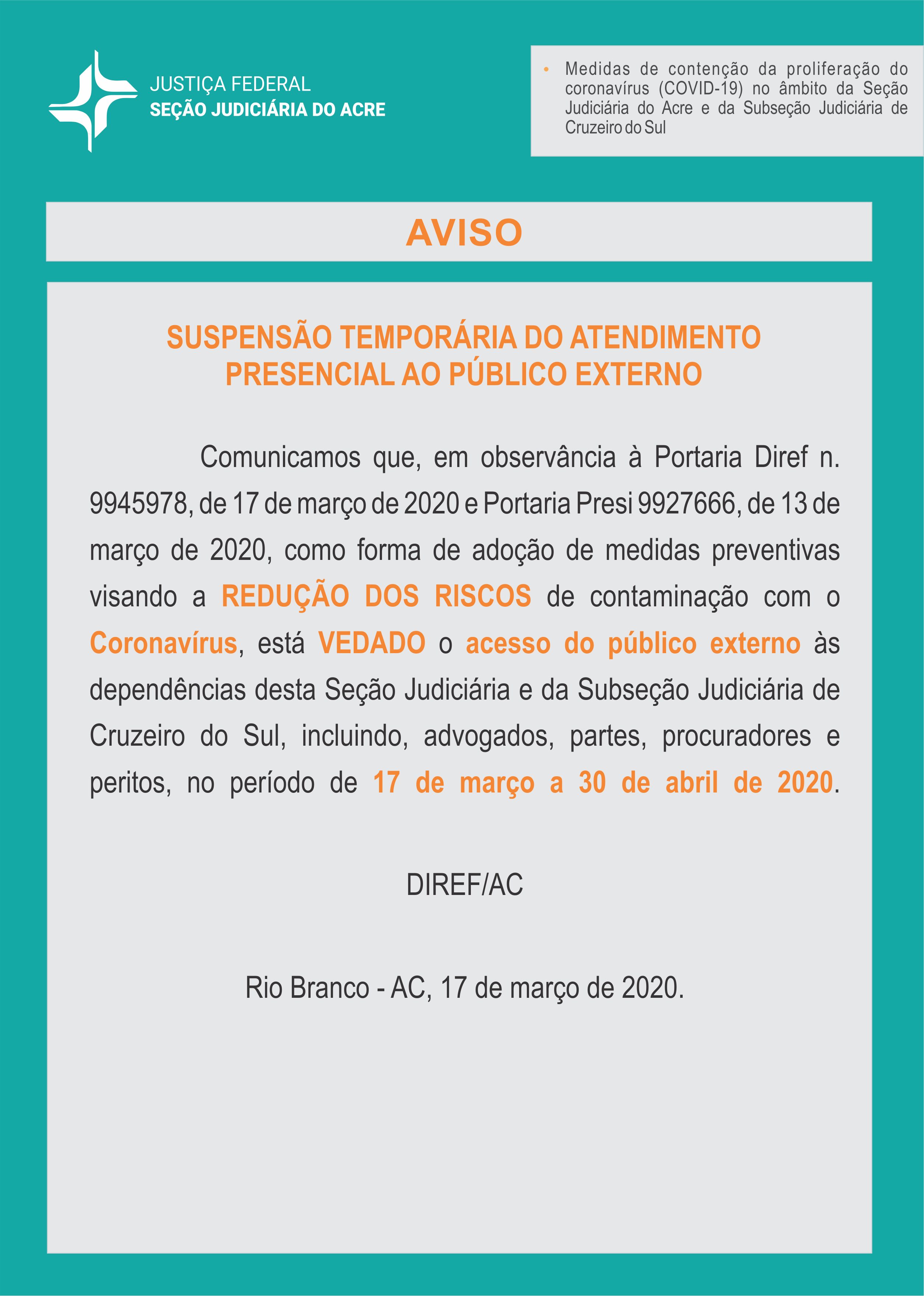 A Justiça Federal do Acre está suspendendo temporariamente o atendimento presencial ao público externo, no período de 17 de março a 30 de abril de 2020, como medida preventiva para a redução dos riscos de contaminação com o Coronavírus.