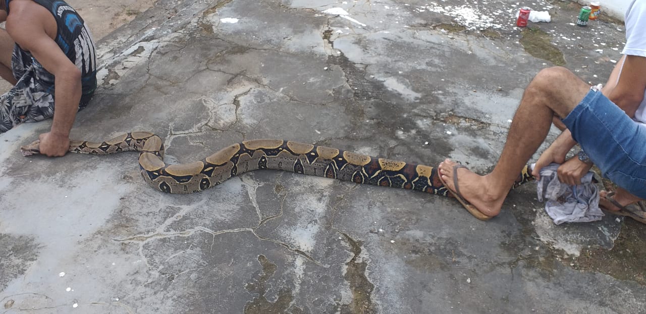 Uma jiboia de pelos menos 4 metros de comprimento foi capturada no bairro Papoco, próximo ao Cristo, em Rio Branco, por dois moradores, na manhã de segunda-feira (30).
