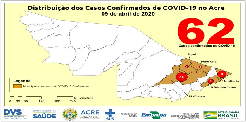 Todos os 62 casos confirmados de coronavírus no estado estão concentrados na região do Baixo Acre, segundo a Secretaria de Estado de Saúde. Mais da metade (48) dos pacientes vivem em Rio Branco. Outros nove estão em Acrelândia. Plácido de Castro aparece em seguida com três casos. Já os vizinhos Bujari e Porto Acre possuem um caso, cada.