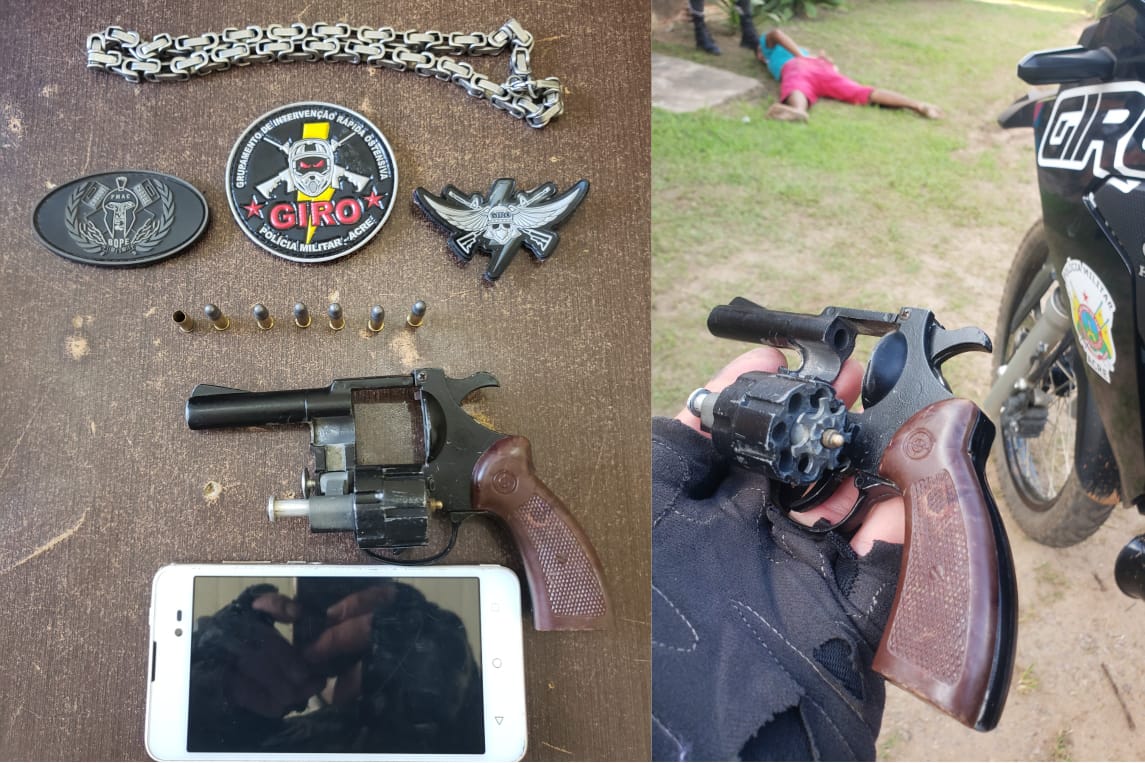 Os policiais deram ordem de parada à dupla e, durante a revista pessoal, encontraram com eles um revólver calibre 22 com seis munições intactas e uma deflagrada. Após um rápido interrogatório, os homens disseram que minutos antes da abordagem roubaram um celular e a quantia de vinte reais.