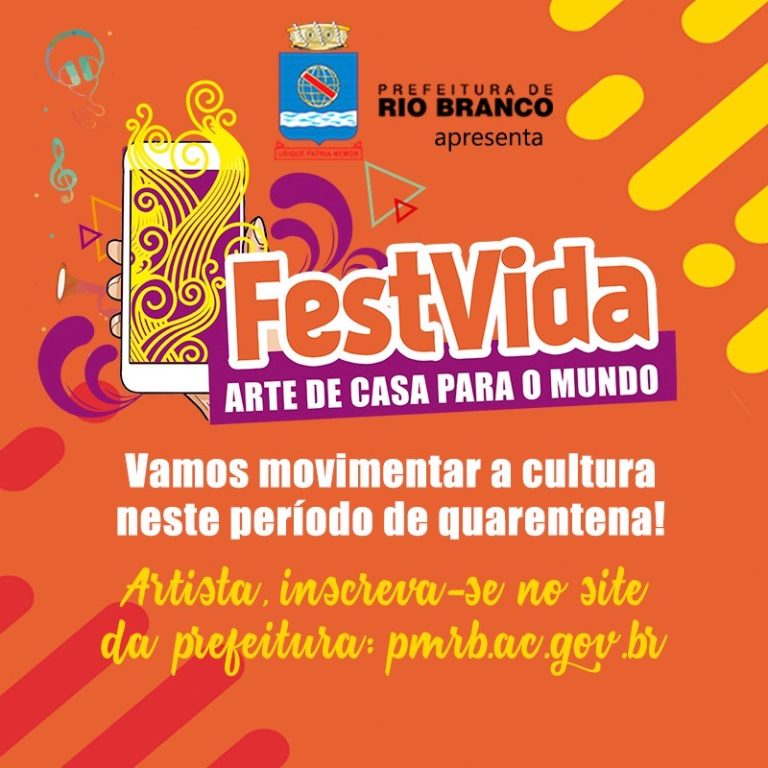 Já as lives deverão ter no mínimo 20 minutos, e no máximo 60 de duração. É necessário que todos os conteúdos contenham em sua legenda “Prefeitura de Rio Branco apresenta: FestVida Arte de Casa para o mundo”, junto com as hashtags #FestVida #ArteEmCasa #PMRB #FGB #OBemColetivoÉOQueNosMove.