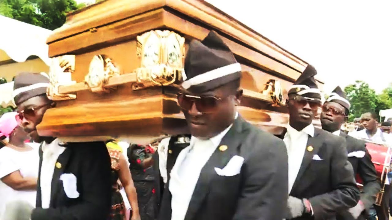Ao assistir esse meme pela primeira vez eu jurava que esses caras eram parentes do senhor Omar que participou da série Todo mundo odeia o Chris. Mas na verdade o vídeo foi gravado em um funeral real que ocorreu em Acra capital do Gana. Segundo informações a BBC foi até o país de Gana onde realizou uma entrevista no ano de 2015 com o criador desse movimento, o criador do movimento é conhecido como sendo o agente funerário Benjamin Aidoo. E o que para nós parece algo muito estranho para se realizar em um enterro, saiba que esses homens são pagos para alegrarem o funeral.