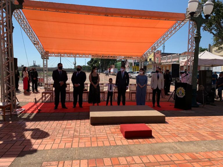 Um ato simbólico da troca da bandeira do Calçadão da Gameleira nesta segunda-feira (15) marcou a celebração do aniversário de 58 anos da elevação do Acre à categoria de estado. O governador Gladson Cameli liderou o ato, ao lado da prefeita Socorro Neri e do ministro interino da Saúde, Eduardo Pazuello, que está na cidade para inaugurar o hospital de campanha para tratamento de pessoas acometidas pelo coronavírus.