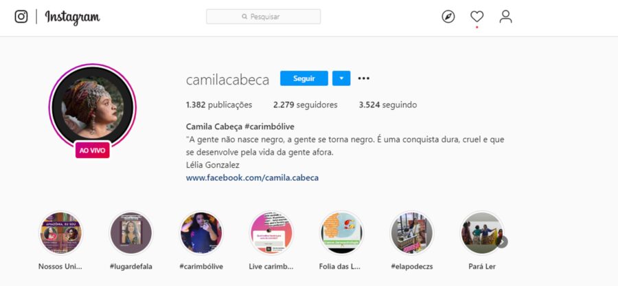 Camila: Nunca tinha feito lives. Até tinha redes sociais movimentadas, mas nunca tinha feito. Fiquei deprimida como artista, porque tinha oficinas programadas – isso significava muito pra mim em termos financeiros. Sou da dança, né? Na vida, até as pedras rolam. No começo, fiz, me empolguei, duas vezes na semana, duas vezes no dia. Mas depois fiquei: “Não dá”. Até por sentir a necessidade de diluir o conteúdo, me descobrir dessa forma. Até que sai do Instagram e fui parar no Facebook, uma outra plataforma e em outro momento da pandemia – quando ‘pegou mais’ na cidade.