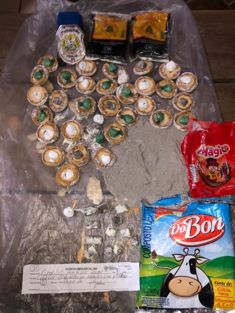 Durante um procedimento de revista nos pertences entregues pelos familiares dos presos Complexo Penitenciário de Rio de Rio Branco, policiais penais apreenderam na manhã desta quinta-feira, 23, 28 trouxas de cocaína, 20 tabletes de maconha, dois pacotes de tabaco e 200g de rapé que estavam embalados em pacotes de leite em pó e de achocolatado.