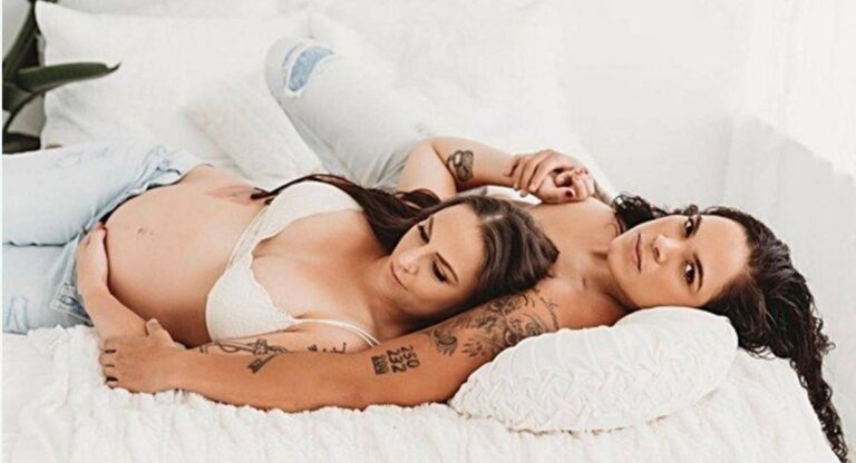 As duas posaram para registrar o estágio da gestação: Amanda surge abraçada à Nina, que exibe o barrigão da reta final da gravidez. “Estamos muito ansiosas por essa fase em nossas vidas”, diz Amanda.
