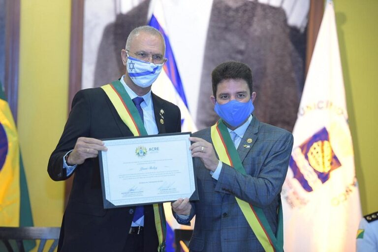 O embaixador de Israel no Brasil, Yossi Shelley, foi condecorado pelo governador Gladson Cameli com a medalha de maior honraria do Estado: a Ordem da Estrela do Acre. A solenidade ocorreu na noite desta quinta-feira (10) no Memorial dos Autonomistas, no Centro.