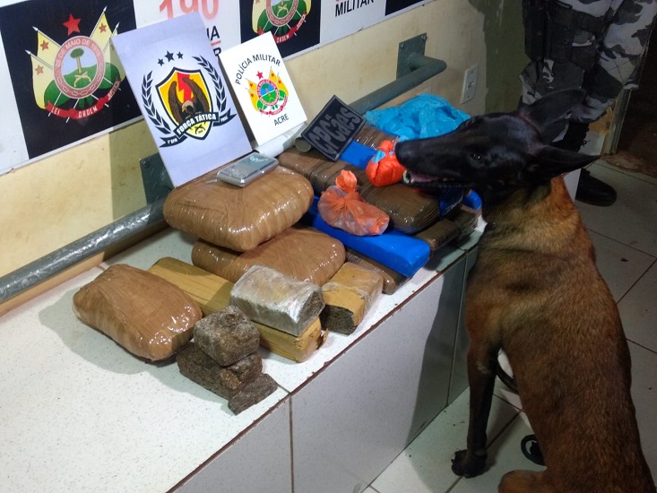 Rudhery Melo portava 370 gramas de cocaína na hora da prisão, mas a situação se agravou após a cadela Elô, da Companhia de Policiamento com Cães (CPCães) do Batalhão de Operações Especiais (Bope), farejar 19 quilos de maconha que estavam enterrados no quintal. [Foto: PMAC]