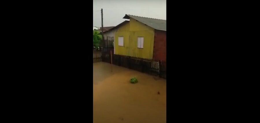 A forte chuva que caiu em Sena Madureira, no interior do Acre, neste sábado (26) alagou a rua Benjamim Constant, próximo ao Centro da cidade, e deixou moradores isolados, sem poderem sair de suas casas.