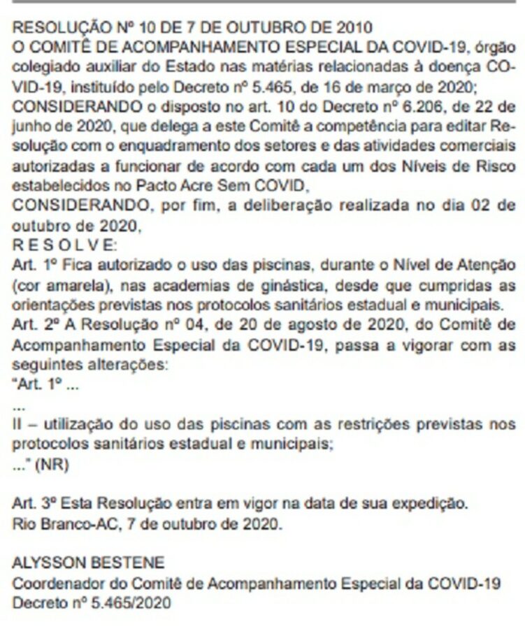 Depois da Federação Aquática do Estado do Acre (Faea) emplacar uma campanha pela liberação das piscinas no Acre e o retorno das atividades aquáticas, na última semana, o Comitê de Acompanhamento Especial da Covid-19 publicou nesta quinta-feira (8), no Diário Oficial do Estado, uma resolução autorizando a retomada dessas práticas “durante o Nível de Atenção (cor amarela), em academias de ginástica”, desde que respeitadas as restrições previstas nos protocolos sanitários estadual e municipais.
