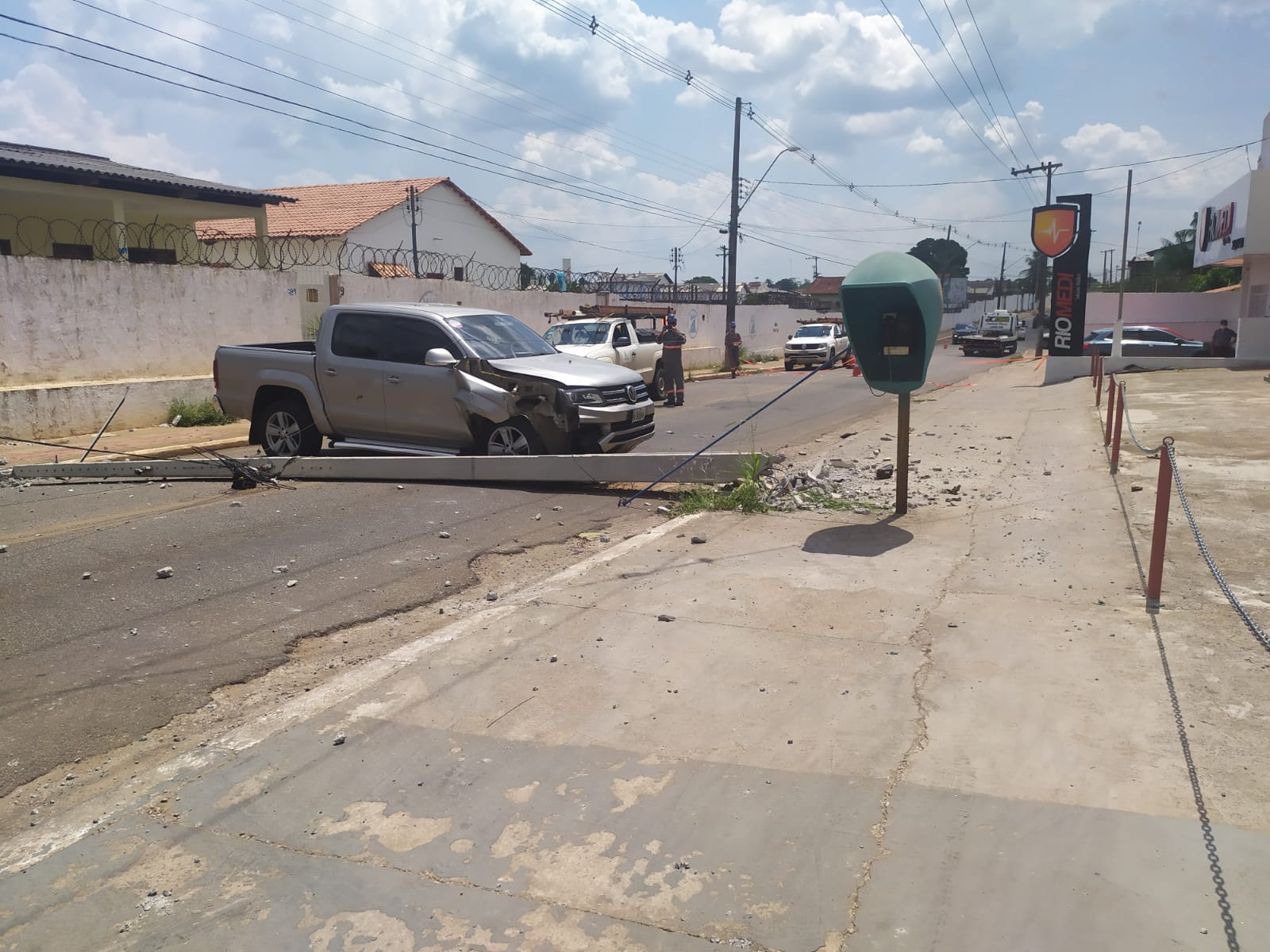De acordo com informações da proprietária da caminhonete modelo de Amarok de cor cinza, um problema hidráulico fez a direção do veículo travar, fazendo com que a motorista perder o controle e atingir um poste de energia, que acabou caindo ao lado da caminhonete.