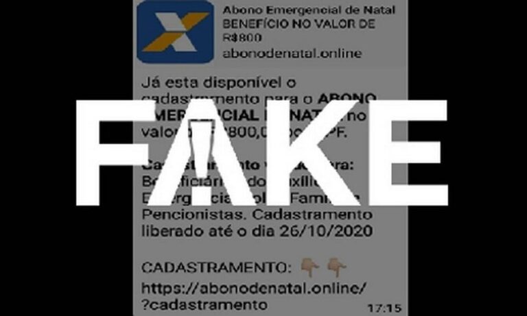 A mensagem falsa diz: “Já esta disponível o cadastramento para o abono emergencial de Natal no valor de R$800 por CPF. Cadastramento válido para: beneficiários do auxílio emergencial, Bolsa Família e pensionistas. Cadastramento liberado até o dia 26/10/2020”. Ao fim, aparece um site para se clicar e inserir dados pessoais, que podem ser utilizados de forma indesejada, deixando o cidadão vulnerável a golpes.