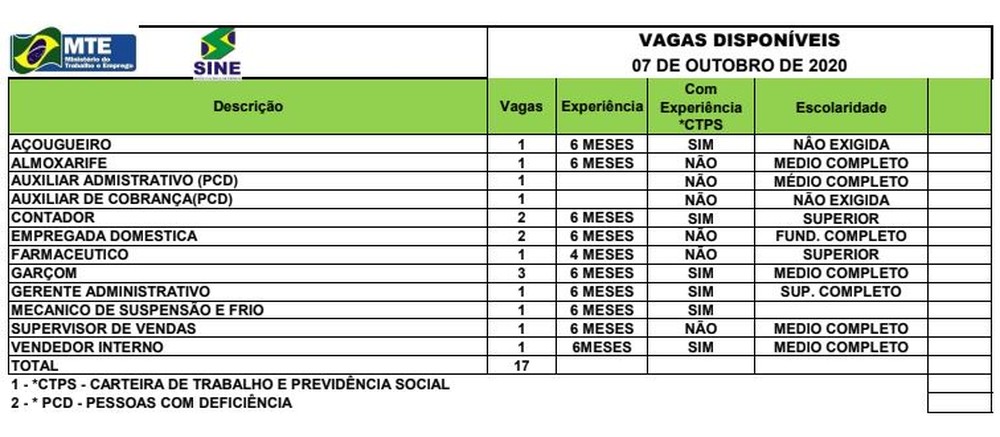 O Sistema Nacional de Emprego do Acre (Sine) disponibiliza 17 vagas para diversas áreas nesta quarta-feira (7) em Rio Branco. Os candidatos interessados devem ir até a OCA, na rua Quintino Bocaiúva, 299 – Centro.