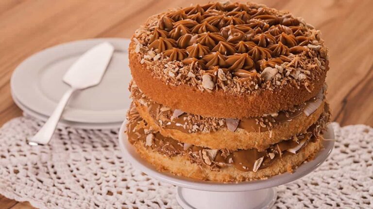 – Intercale até acabar: massa, doce de leite e farofa do biscoito. Em cima, decore com doce de leite e o restante da farofa.