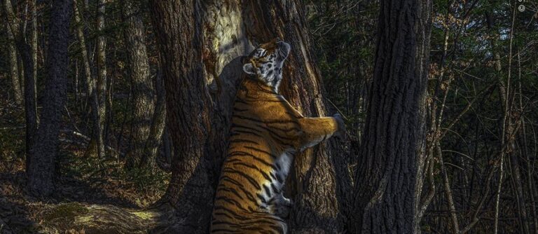 — É um vislumbre de um momento íntimo nas profundezas de uma floresta mágica. Raios de sol baixo de inverno destacam o antigo pinheiro e a pelagem da enorme tigresa enquanto ela agarra o tronco, deixando sua própria marca como sua mensagem.