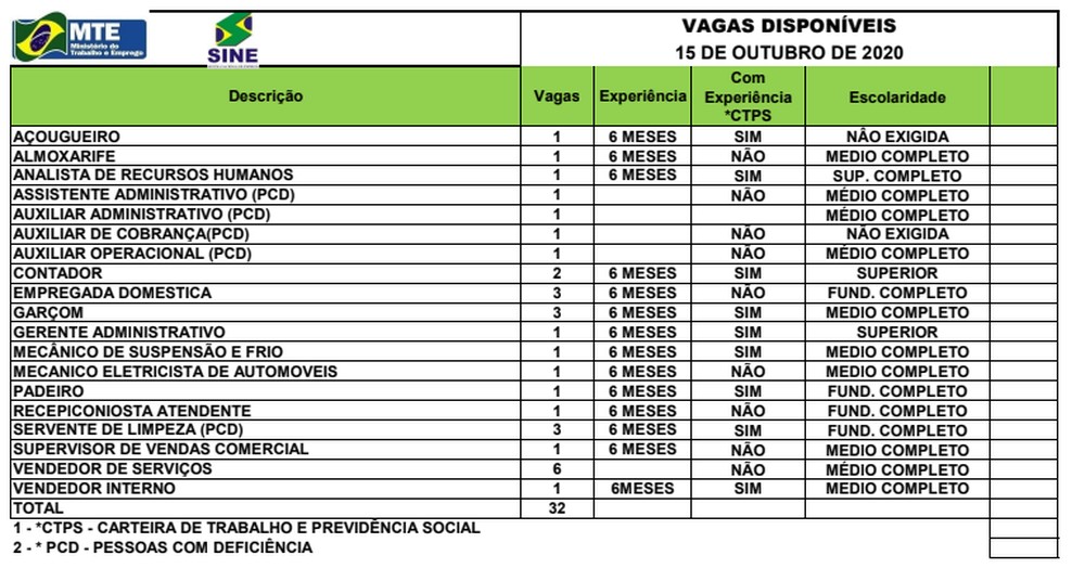 O Sistema Nacional de Emprego do Acre (Sine) disponibiliza 32 vagas para diversas áreas nesta quinta-feira (15) em Rio Branco. Os candidatos interessados devem ir até a OCA, na rua Quintino Bocaiúva, 299 – Centro.