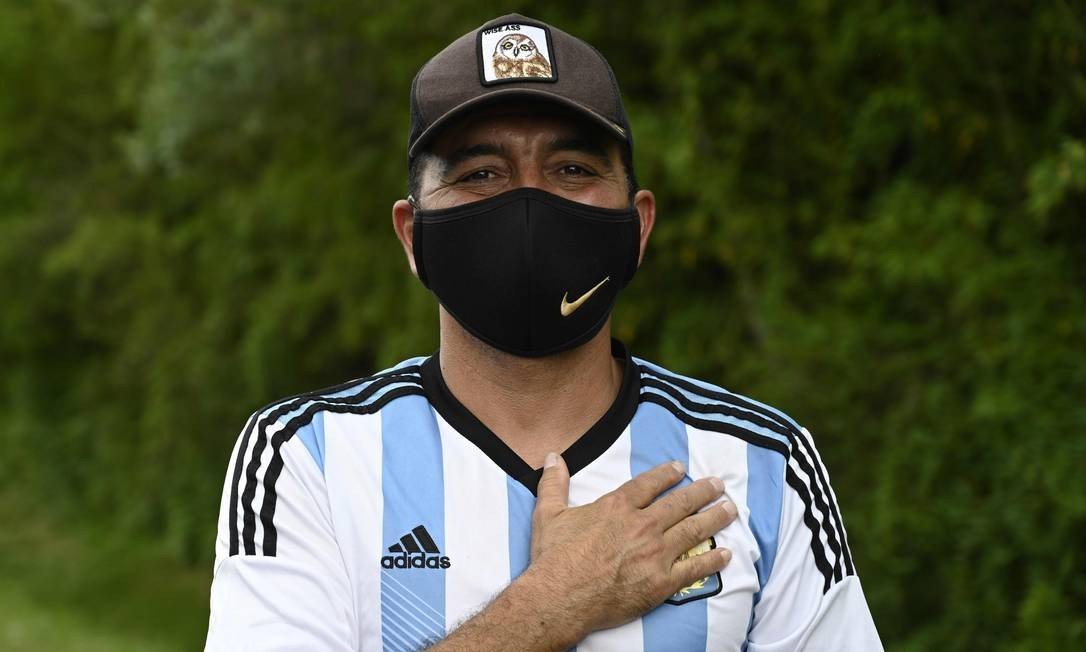 Torcedor presta reverência a Maradona, em frente ao condomínio onde fica a casa do craque argentino, em Benavidez, na província de Buenos Aires [Foto: Juan Mabromata/AFP]